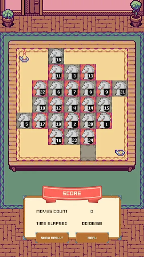 A chess puzzle consisting of 24 numbered knights randomly distributed among 25 chessboard squares. The objective of this puzzle is to move the KNIGHTS into numerical order in the fewest possible moves.