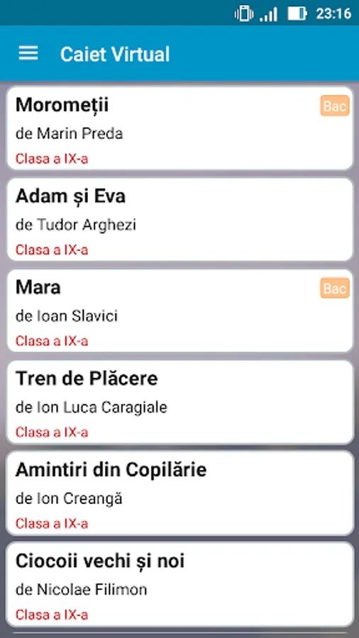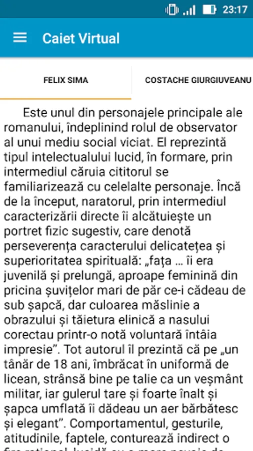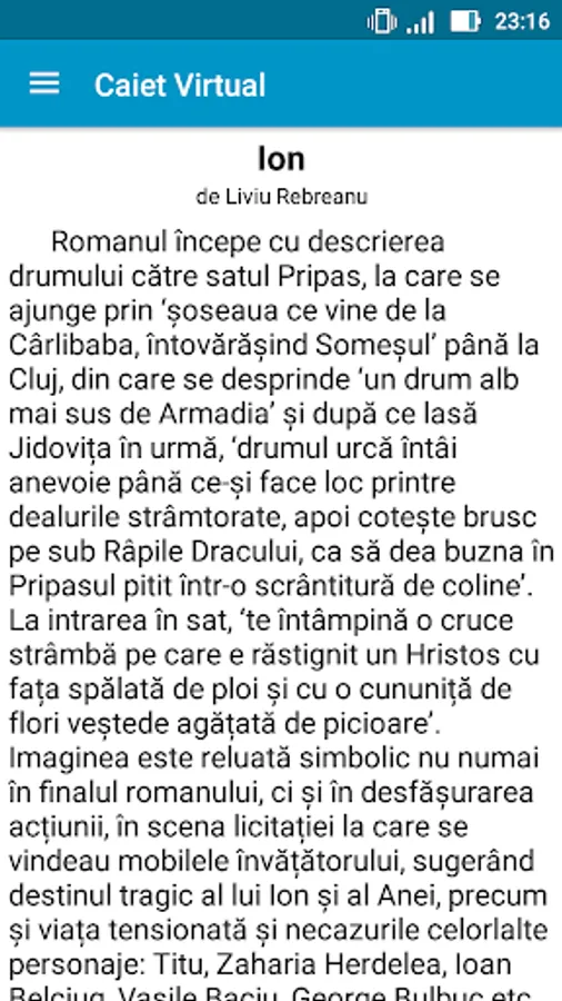 Această aplicație conține rezumatele operelor literare cât, caracterizările personajelor în limba română, definițiile și informațiile despre autori, și este foarte ușor de folosit, la testele de limba română cât și la scrierea temelor primite pentru acasă când nu găsiți un rezumat sau o caracterizare a personajului bună pe internet. Aplicația noastră este soluția! Aplicația este de asemenea și un ghid foarte bun pentru examenul de bacalaureat, afișând opere care trebuiesc învățate pentru bac.