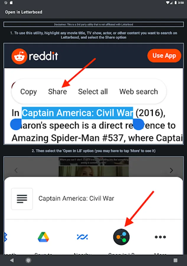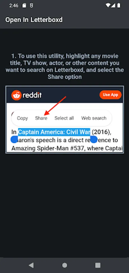 This utility allows you to highlight any text (for instance -- movie titles, TV shows, actors, directors, etc) from anywhere on your phone (messages, websites, etc) and use the Android native share option to quickly lookup that selected text on the Letterboxd service.