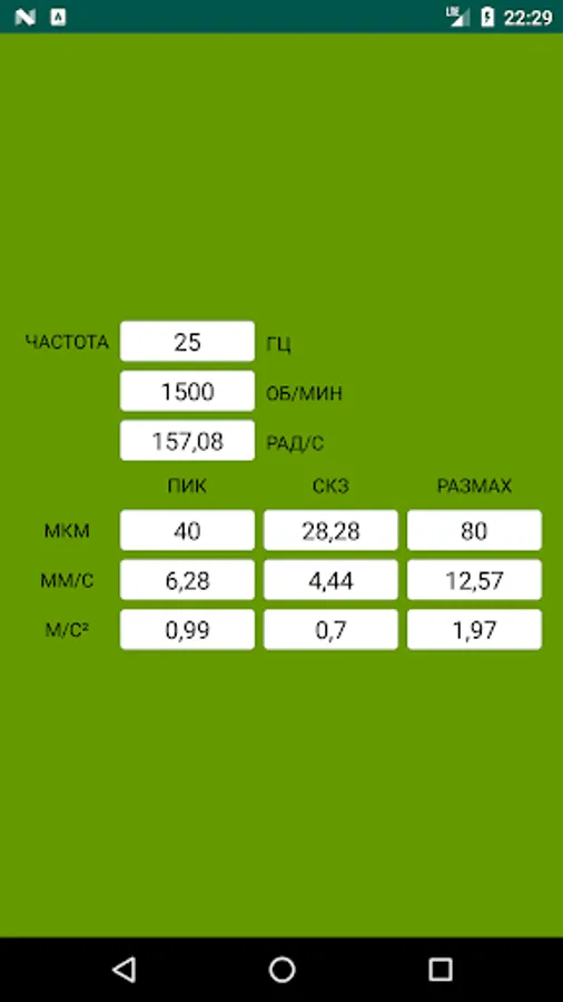 The simplest unit of vibration. The object of calculation is a sinusoidal signal. Selecting the oscillation frequency and changing any of the values you instantly get the rest of the calculated values. Such a calculation helps to establish threshold vibration levels in various units of measurement during balancing work.