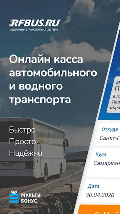 RFBUS.RU is a mobile application of the federal transport system for the sale of intercity and suburban bus, water and sea transport tickets.