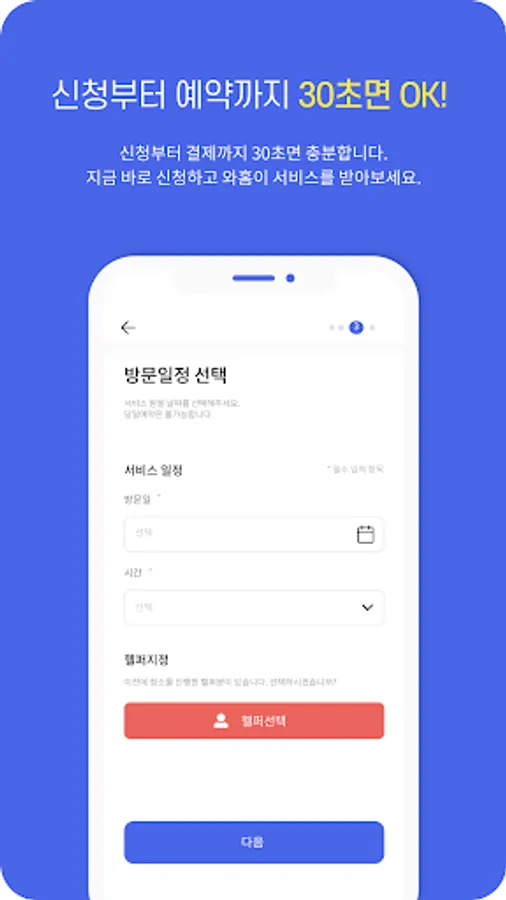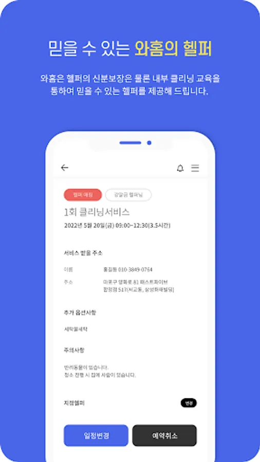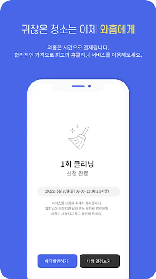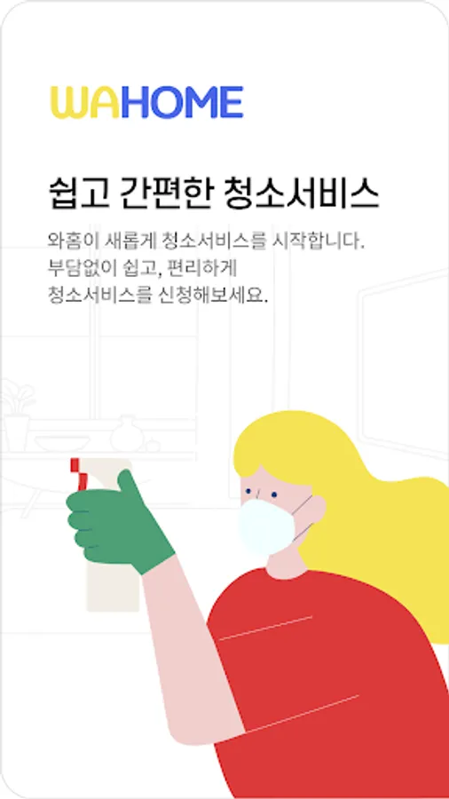 와홈은 몇번의 터치만으로 간편하게 신청을 할 수 있는 청소 매칭 서비스입니다.