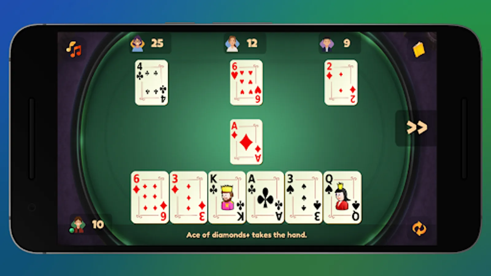 Deal and play are clockwise. Each player receives seven cards and any remaining cards are set aside. Forehand leads to the first trick and everyone has to head the trick if able, which they can do by playing a card of a higher or equal rank. A player who cannot head the trick, plays the lowest card held. The player who played the highest card makes the trick and leads to the next.