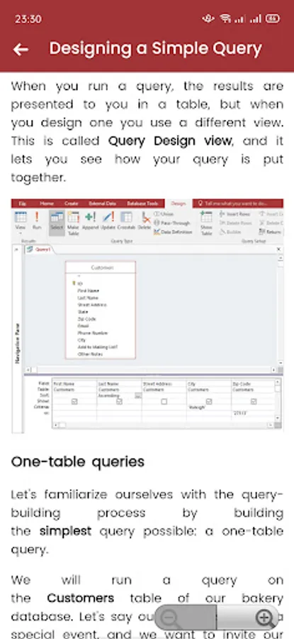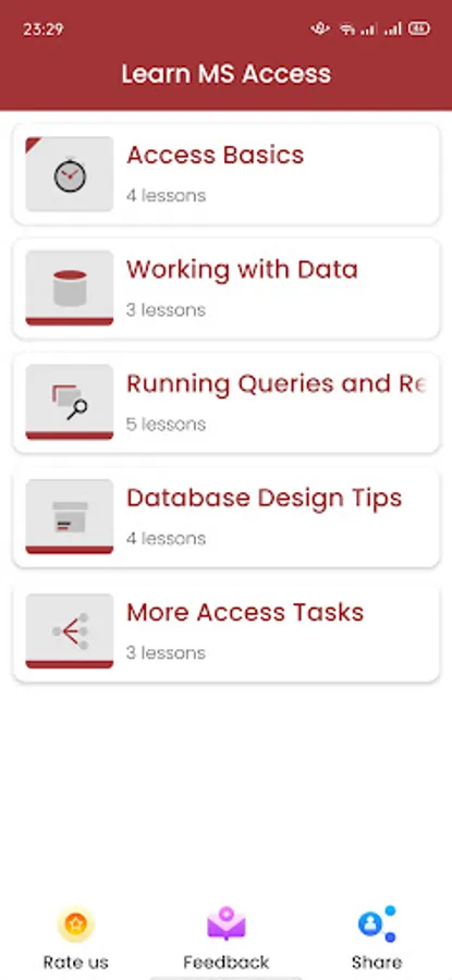 Learn MS Access introduces you to very detailed lessons, below are the contents and features of the application: