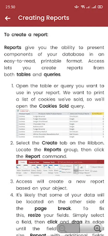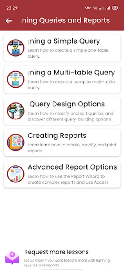 - Running Queries and Reports: Includes 5 lessons: Designing a Simple Query, Creating Reports, Designing a Multi-Table Query.....
