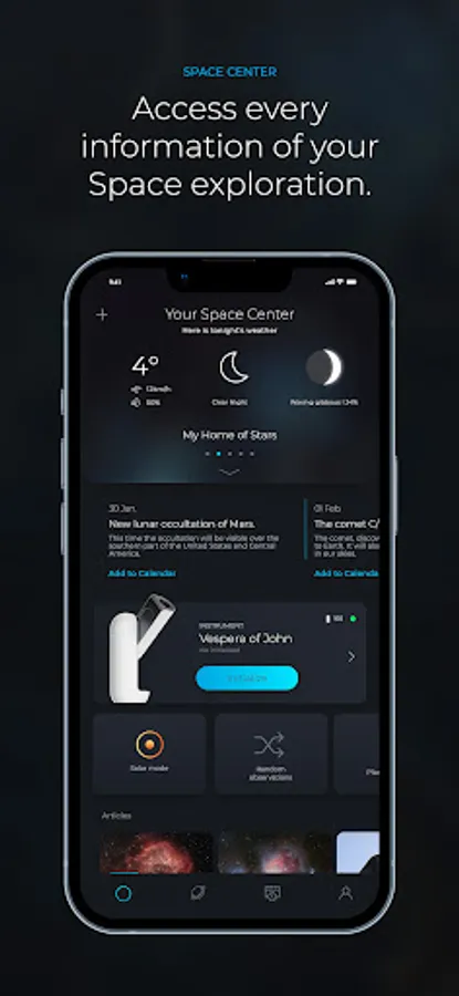 Take control of your station from the Space Center: prepare your observation evening by checking the weather forecast, create and manage your observation locations, check the parameters of Stellina/Vespera... You can also read the astronomical news or our advice on Stellina and Vespera on our blog while waiting for nightfall.