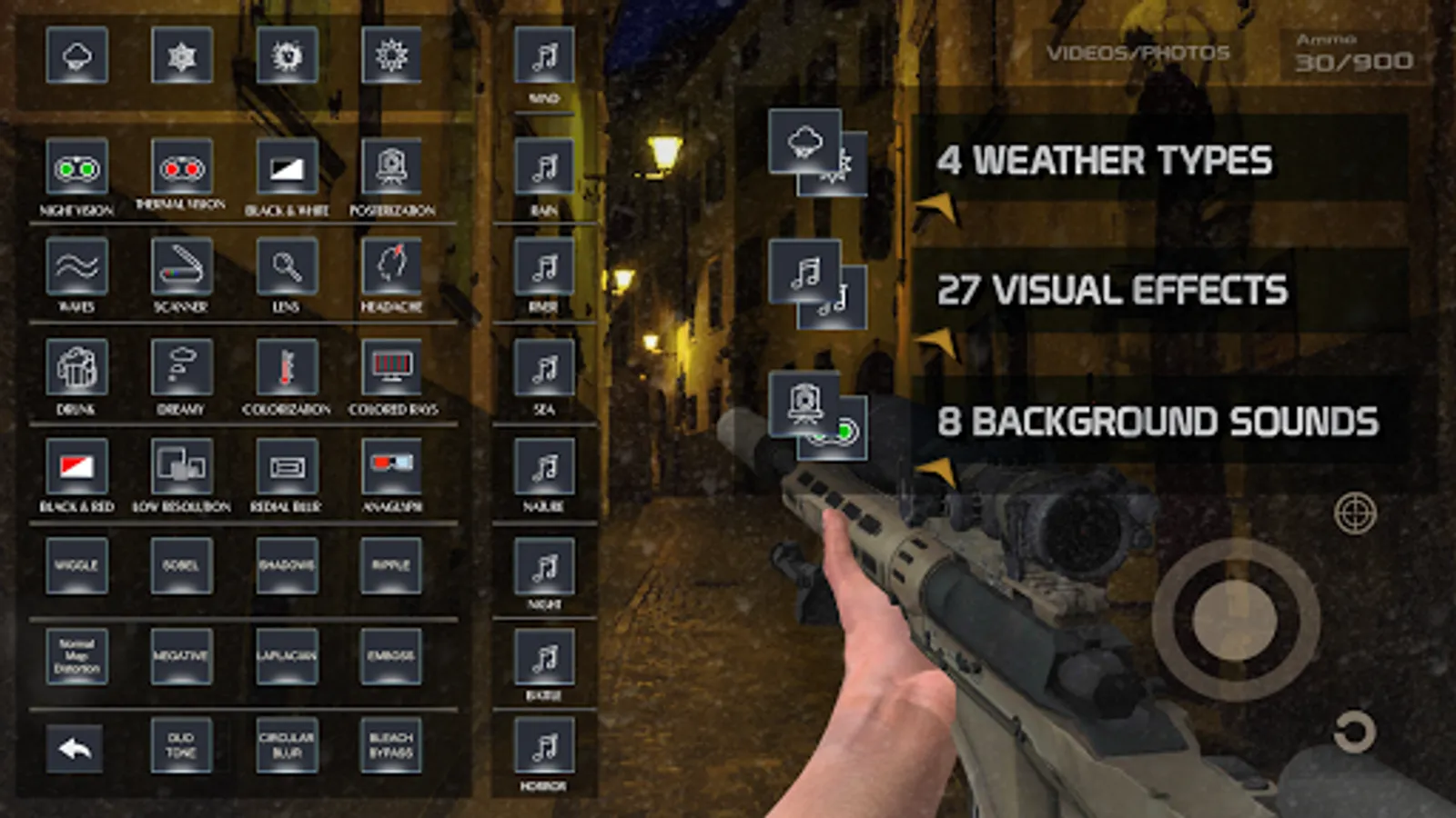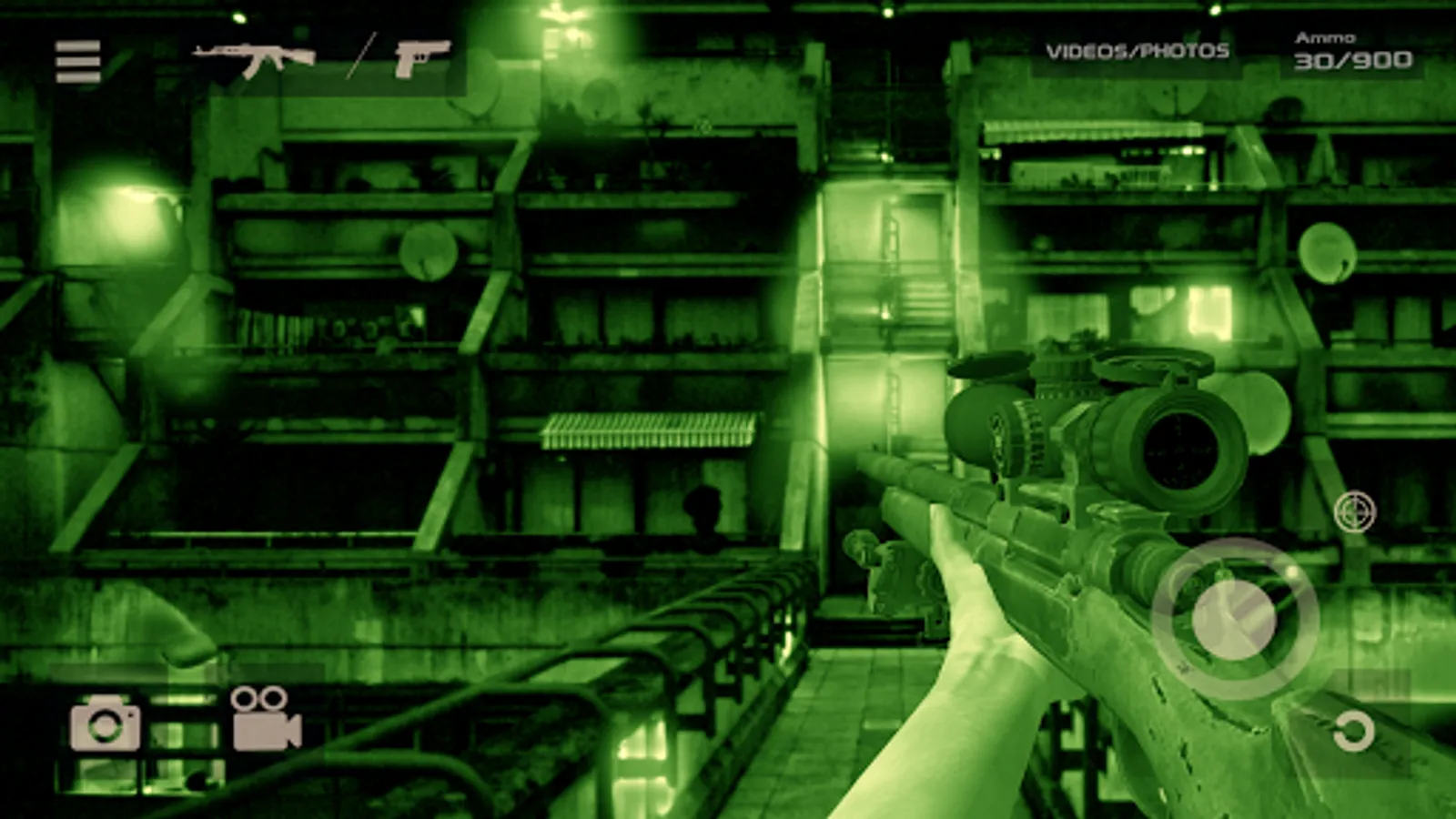 App uses device’s camera to modify it to real sniper scope view, also zoom mode with sniper scope.