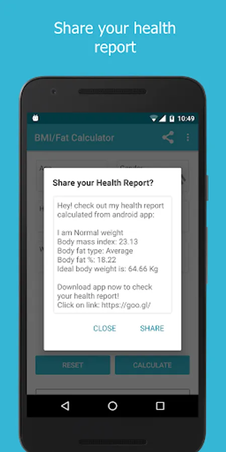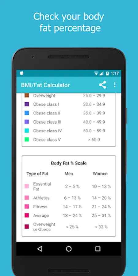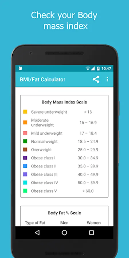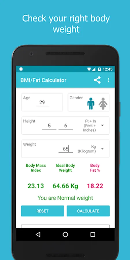It is a free app that will allow you to calculate your Body mass index, Body fat % and Ideal body weight based on your input values. To calculate these things app uses the scientific formula derived by the great researchers. All these calculations needs these parameter like Age, Gender, Height and Weight. The body mass index (BMI) is a statistic developed by Adolphe Quetelet. Ideal body weight given by D.R. Miller.