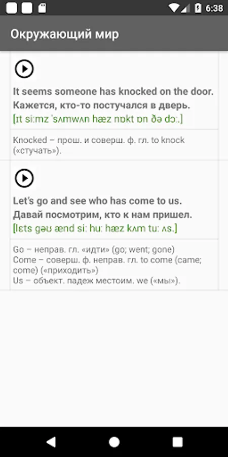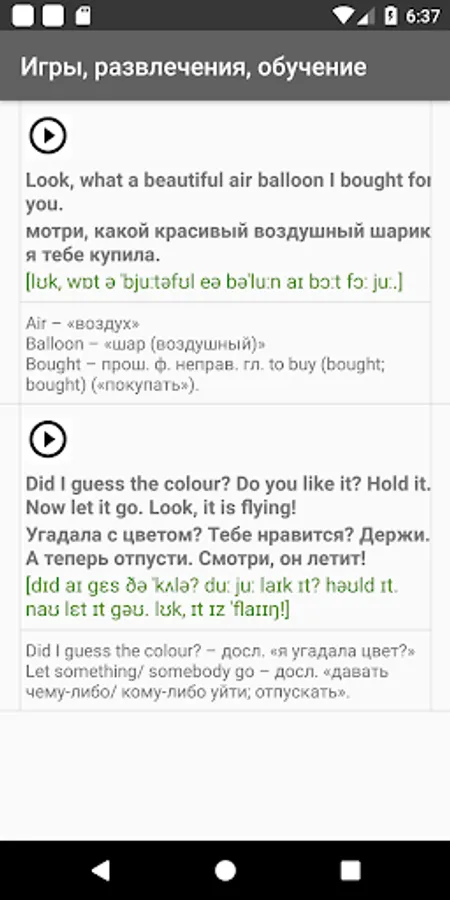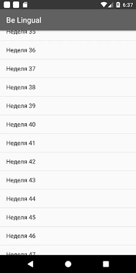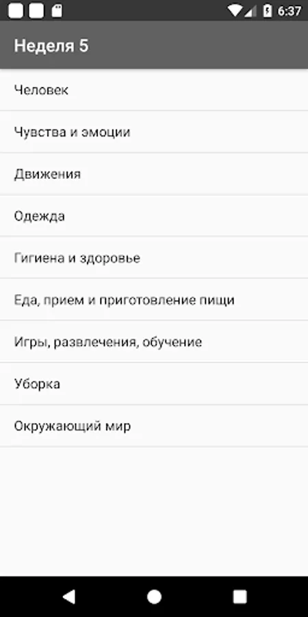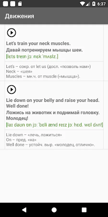 Select a week, then a topic, and you will see various phrases in English and their translations with explanations and audio accompaniment.