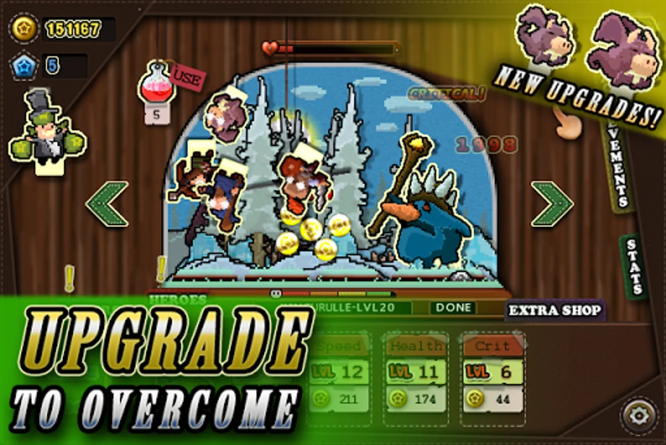 Defeat bosses to travel to new areas and recruit new heroes to join your adventure.