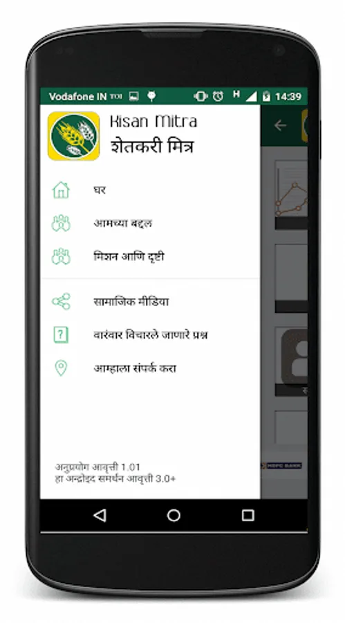 यह ऍप हिन्दी, मराठी और अंग्रेजी भाषाओं में शुरू की गयी है । हमारा उद्देश्य है की किसान अपनी बुद्धि और अनुभव के साथ साथ टेक्नोलॉजी का भी समान रूप से तालमेल बिठाके उसके परिवार की आजीविका ही नहीं बल्कि देश के विकास में भी सक्रिय समनवय और साजेदारी निभा सके ।