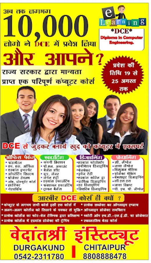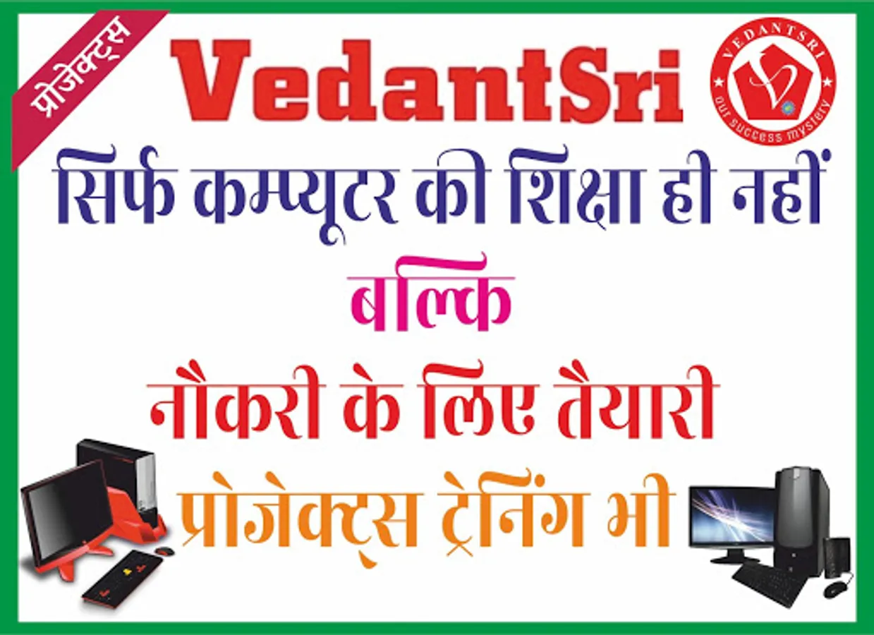 VedantSri is an organisation of training computer courses, English Speaking, Computer Teacher Training Etc, VedantSri Sponsored By SRKV and VedantSri Welfare Society, Here all Education course Charges are very low according to higher range of advance courses, VedantSri Provides Computer Scholarship Course Program and One of most famous computer course programs is called DCE (Diploma in computer Engineering), DCE is most famous computer advance course of training, in DCE Most important computer courses as like Office Management, Accounting, Advance Internet, Desktop Publishing Designing, Hardware, Networking courses are Taught, By Learning DCE students are able to do all office work, accounting work, designing work, system administration work, Network management work Etc,