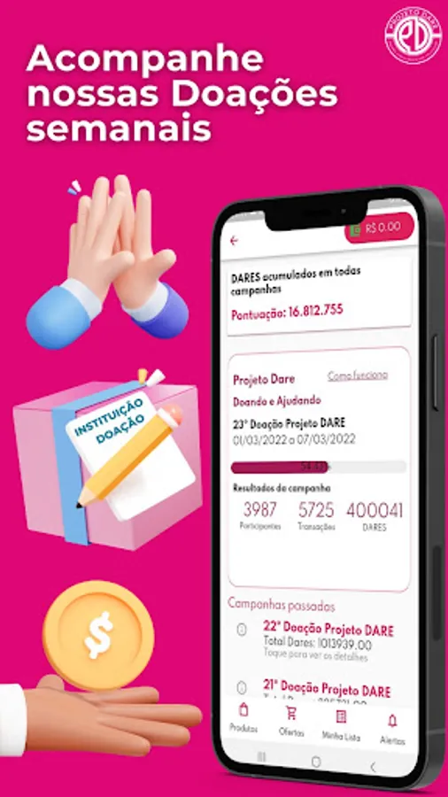 Application for the Varandas market network to bring convenience to the customer in consulting products and participating in the DARE project that yields cashback advantages to customers, campaigns and offers and also participating in a project that aims to help institutions in favor of people in need.