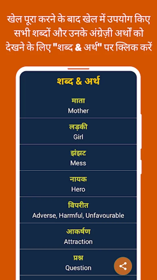 This Hindi word game is very useful for people who are interested to improve their Hindi vocabulary across India and around the world by learning new words and their meanings.