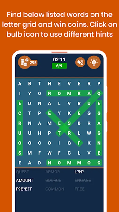 5) You can use hints to reveal the hidden letters from bottom list or reveal the first letter of a word or solve the full word from the grid.