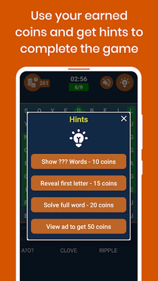 3) Earn coins for each word found and earn extra coins when you take a timer challenge.