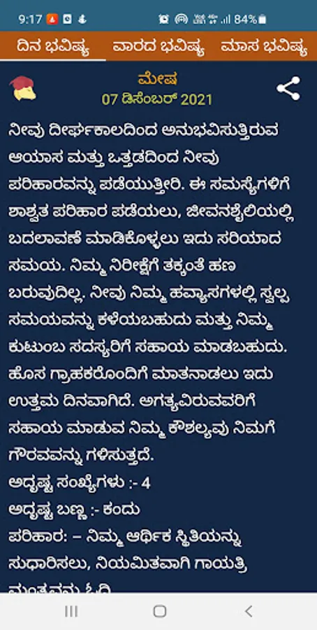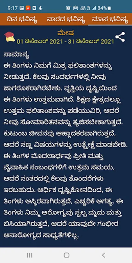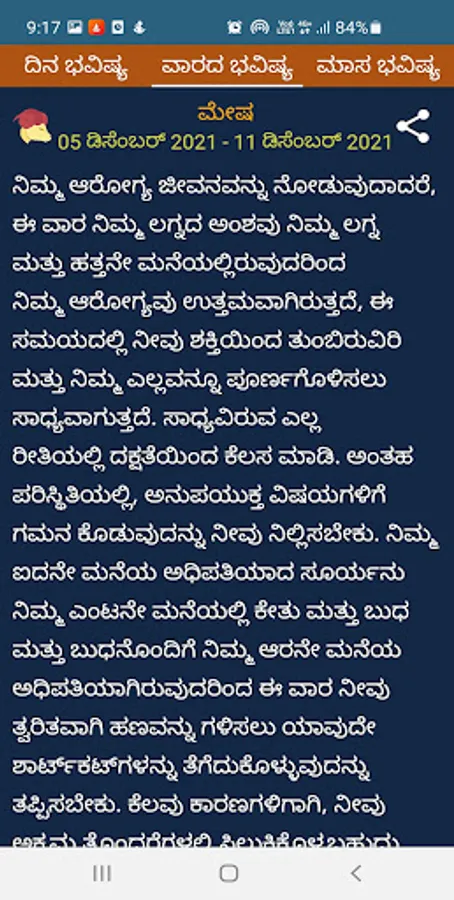 4) For detailed Kannada horoscope predictions, click on any zodiac sign and view the rashi bhavishya details in daily/weekly/monthly format by swiping between the respective tabs.