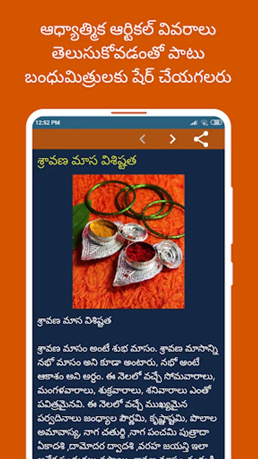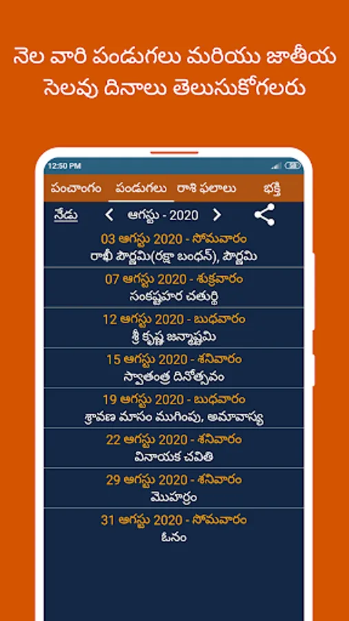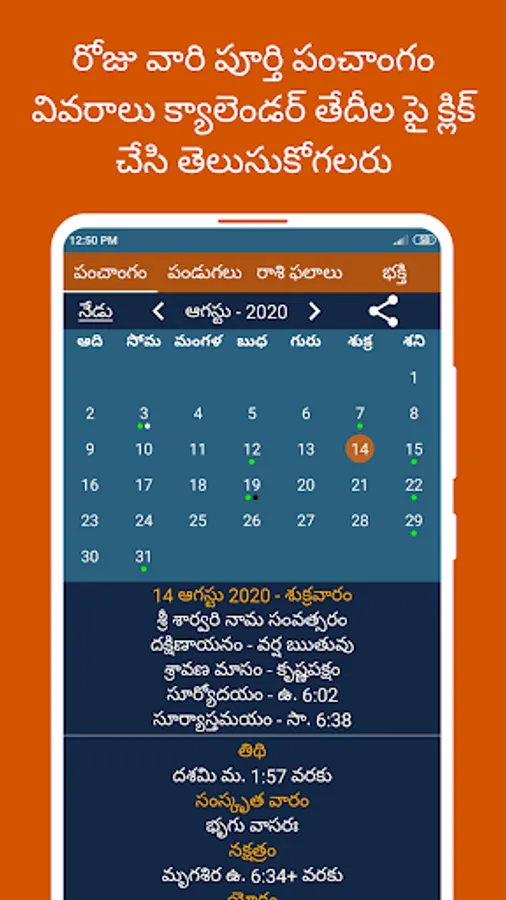 3) Swipe between Panchangam, Festivals, Rashi phalalu and Bhakthi tabs to view detailed Panchangam results or festivals list or Telugu Horoscope details or spiritual articles.