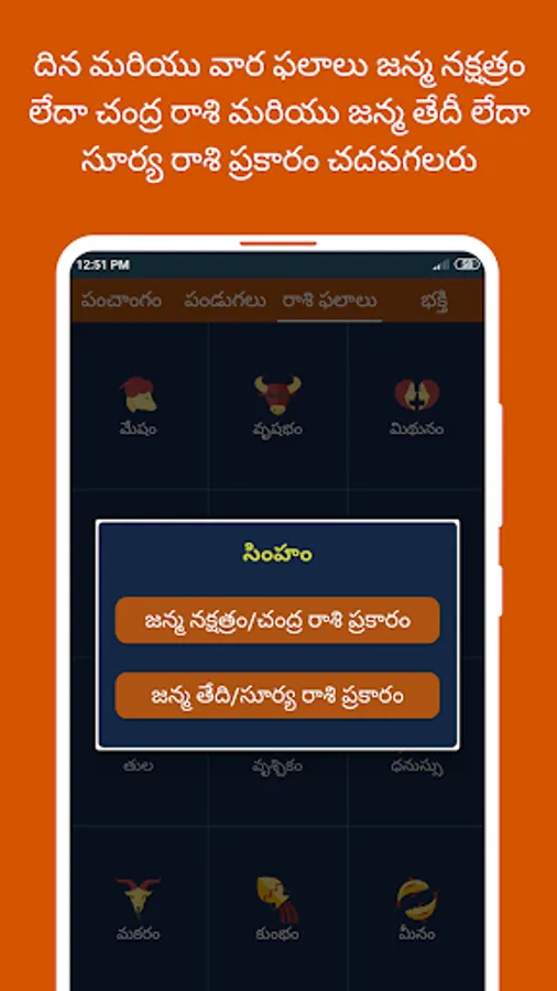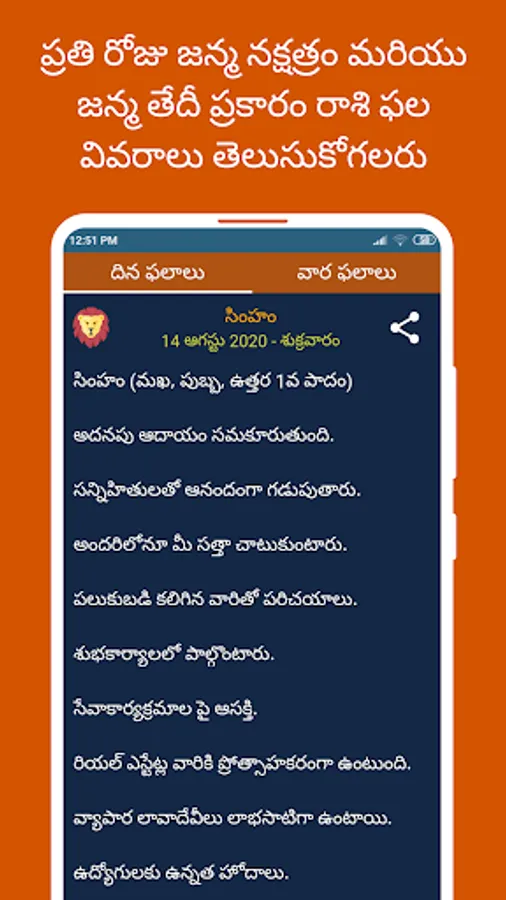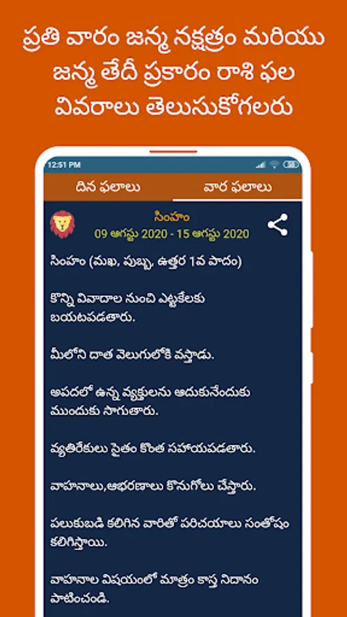 4) For detailed Telugu Horoscope predictions, click on any zodiac sign and view the rashi phalalu details in daily/weekly/yearly format by swiping between the respective tabs.