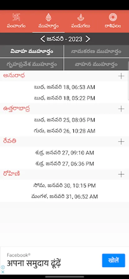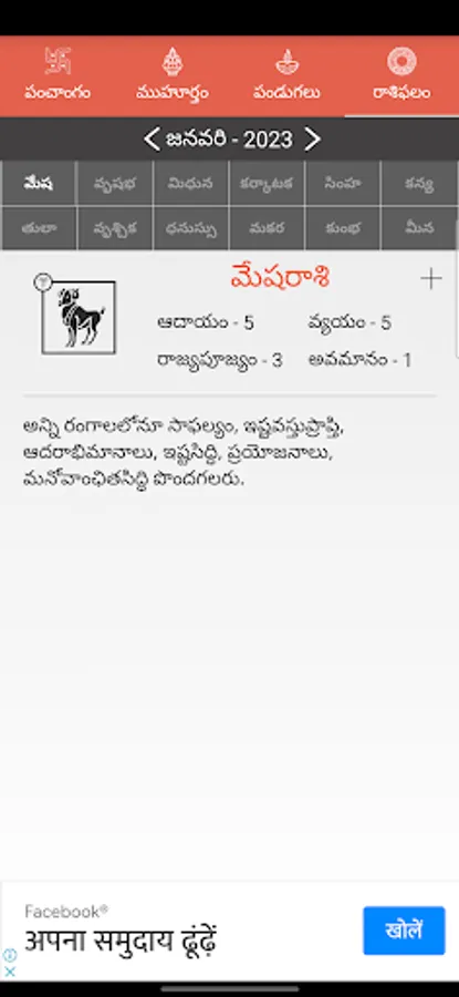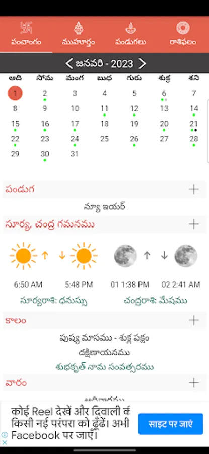 Telugu calendar panchang app serves panchang results with planetary calculations. It is an informative app for people who speaking telugu across globe. With this service, you can easily watch results of panchang,muhurtham and festivals for the particular date and can watch the result of 2023 year.