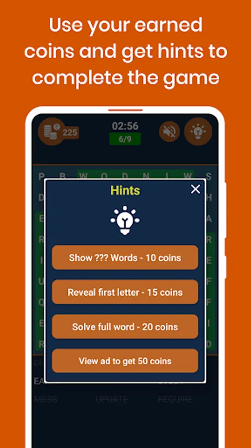 5) You can use hints to reveal the hidden words from bottom list or reveal the first letter of a word or solve the full word from the grid.