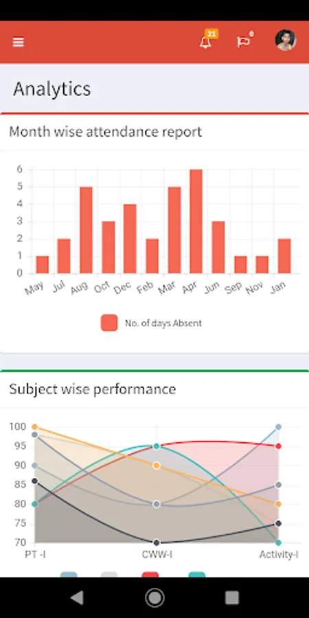 1. Dashboard with reports and analytics related to Student's Attendance, Performance, Fee Dues etc.