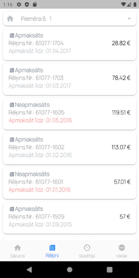 * RĒĶINI – iespēja apskatīt un/vai lejuplādēt jebkuru no 12 pēdējiem rēķiniem;