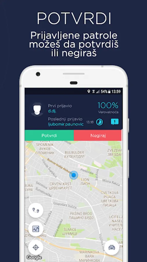Moja patrola omogućava svim korisnicima da samo jednim klikom prijave primećenu policijsku patrolu i da uvek budu obavešteni o patrolama koje su prijavili drugi korisnici. Takođe, svaki korisnik može da potvrdi ili negira prijavljenu patrolu.