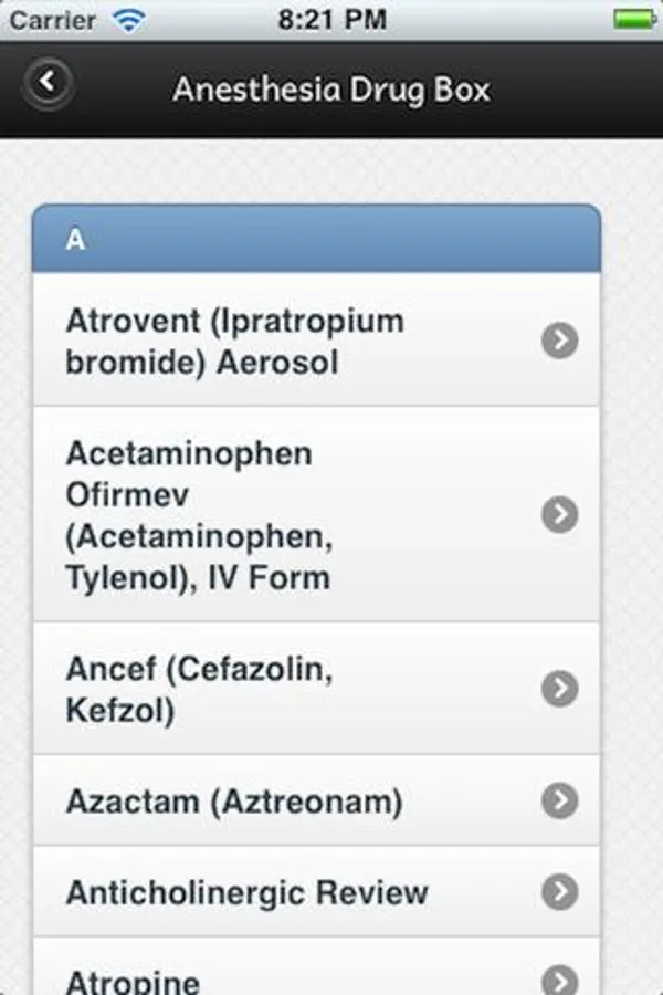 This App contains over 150 drugs/agents/products that we commonly or only sometimes use in the field of Anesthesia.