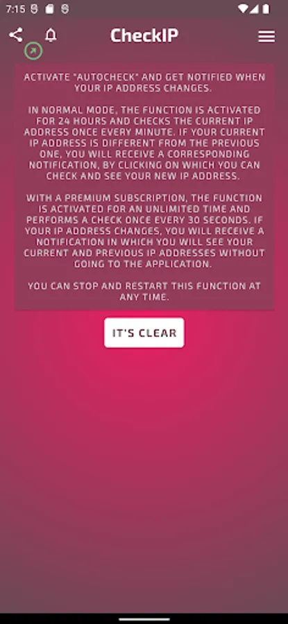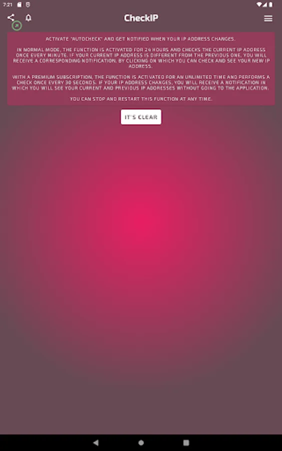 Do you use VPN often? Is your home IP address not static and changing frequently? This app will help you check your current IP address easily and quickly. Ease of use and nice design will make our application an essential attribute of your smartphone.