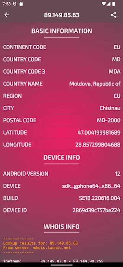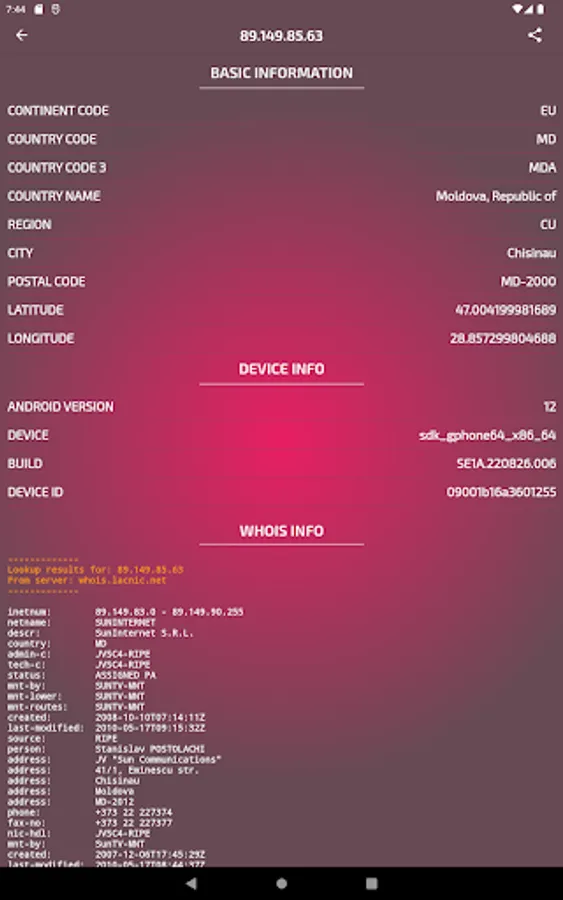 - Latitude and Longitude of the location of your IP address -Divice info