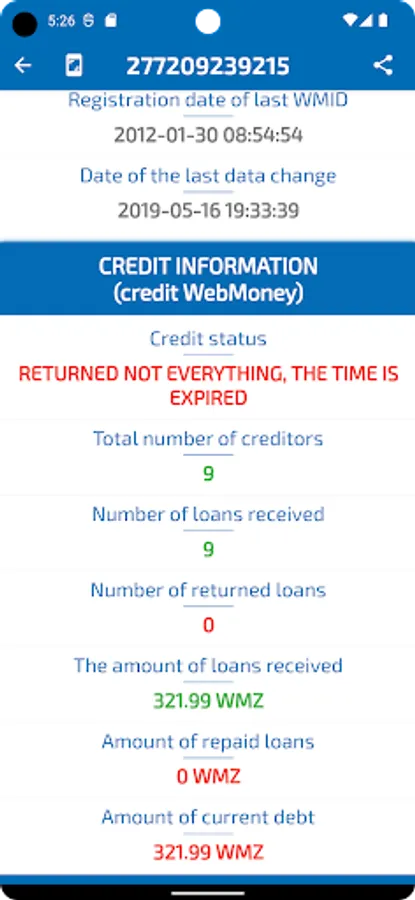 - View credit status, presence/absence of debts in the WebMoney system