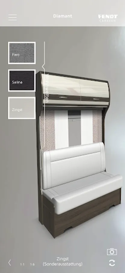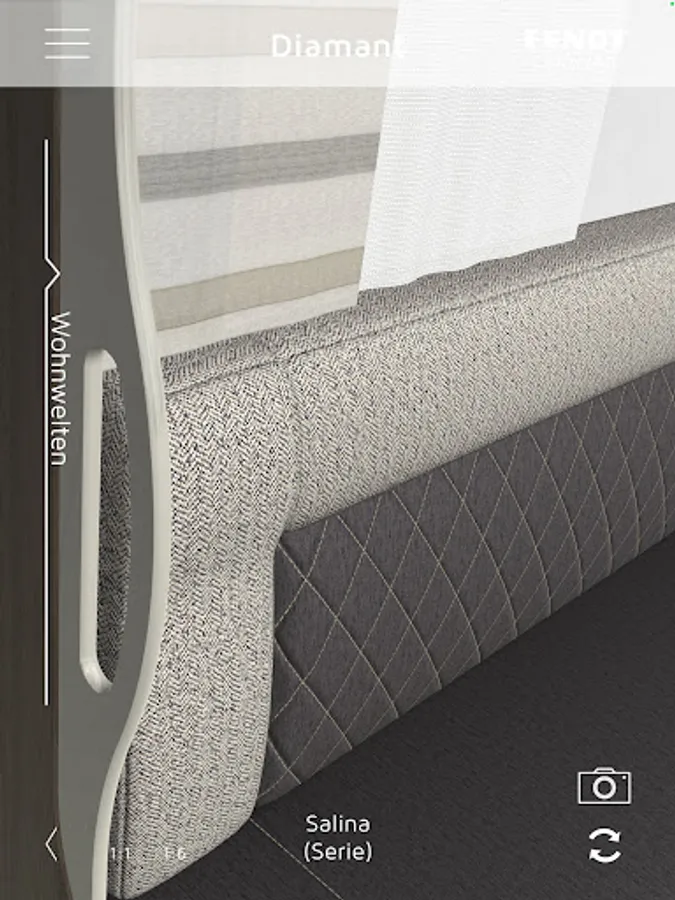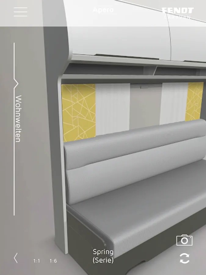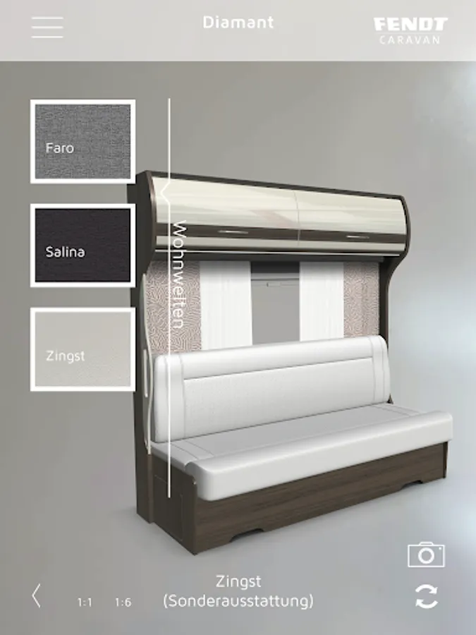 With the latest augmented reality app, Fendt Caravan offers you the option of choosing your personal home from home or on the road. As real as if it were already in front of you. Choose upholstery and decorative fabrics to your taste as a 3D fotorealle representation in 1: 6 or even in original size and record your favorites by screenshot. Thanks to the latest AR technologies, you can display the living world projection both on a graphic code and without graphics directly on the floor or the table.