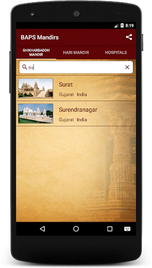 Devotees can easily search Shikharbaddh mandir or Hari mandir or BAPS Hospitals using search tab functionality.