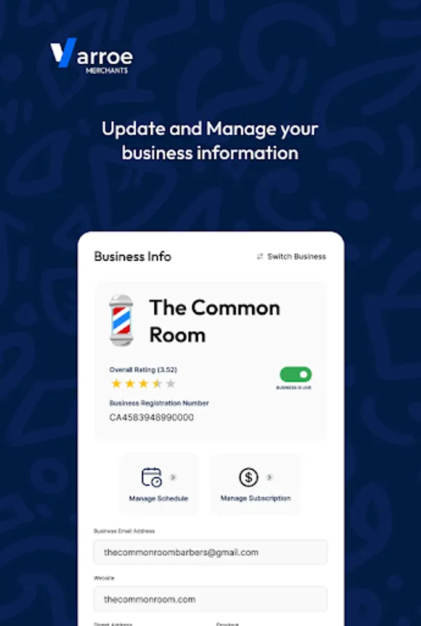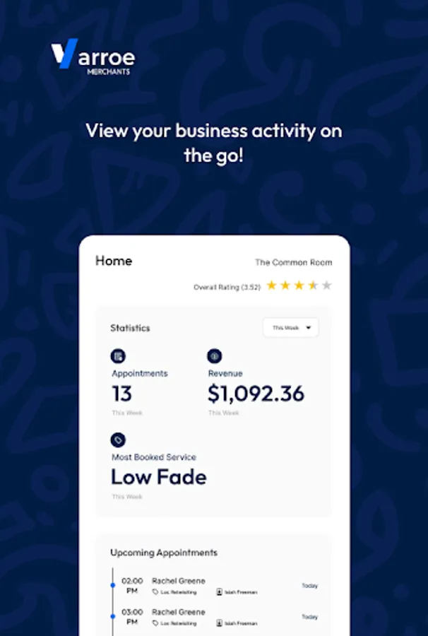 Get access to various Varroe Merchant features on this mobile app. View and manage business info and appointments, view business statistics and many others. Get started by downloading app.