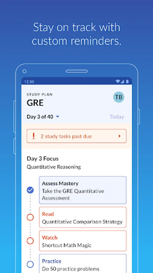 Your custom plan serves you review material, test-taking strategies, and all the adaptive practice problems you need to get the test score you want. Ace keeps you on task and on track and learns when you study so it can provide you with friendly reminders and nudges if you fall behind or recommend a rest day if you’re ahead of schedule! Need extra help? Ace connects you with instant tutors who specialize in your question topic and test type.