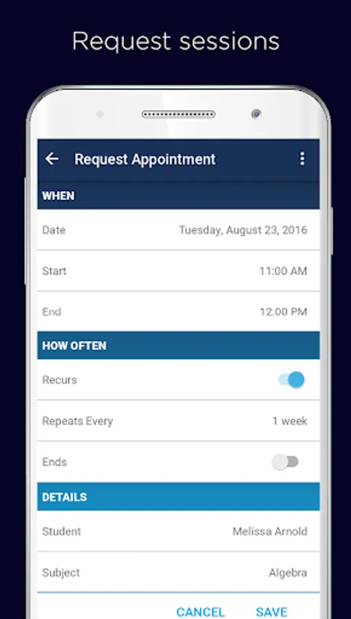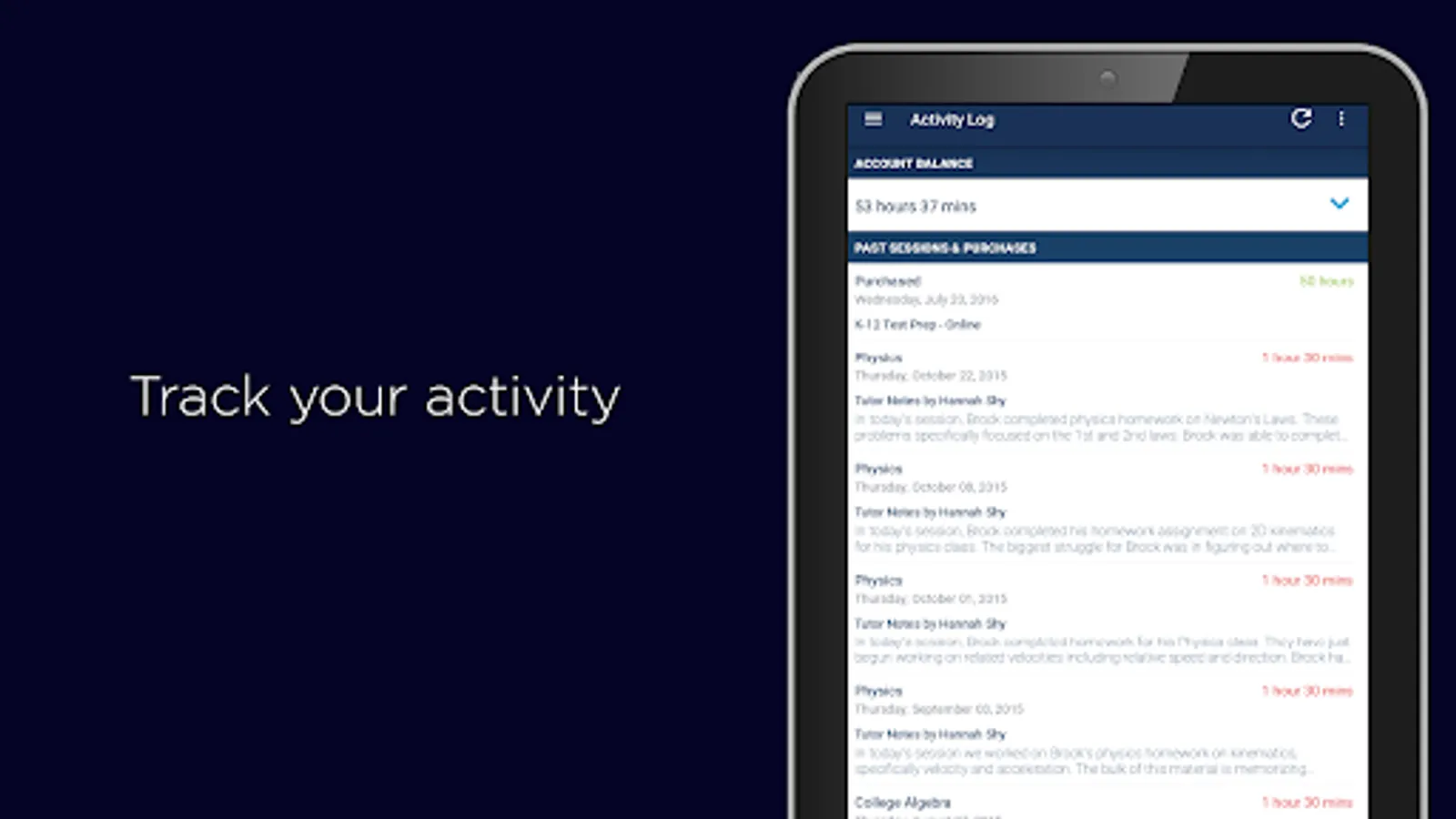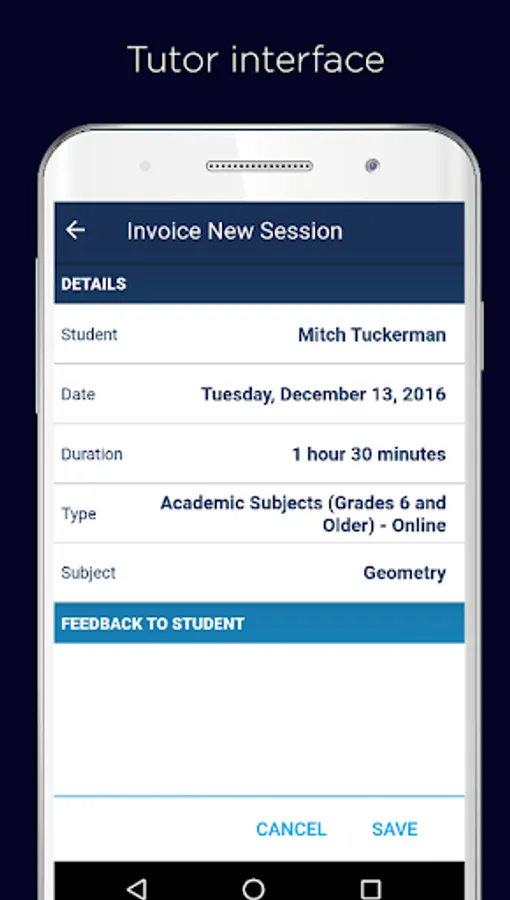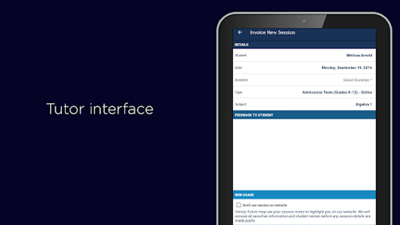 The live online tutoring app by Varsity Tutors for Android helps you get tutoring whenever and wherever you need it with thoroughly qualified tutors. Our tutoring app allows students and tutors to participate in video tutoring, manage their accounts, send and receive messages, and manage appointments.