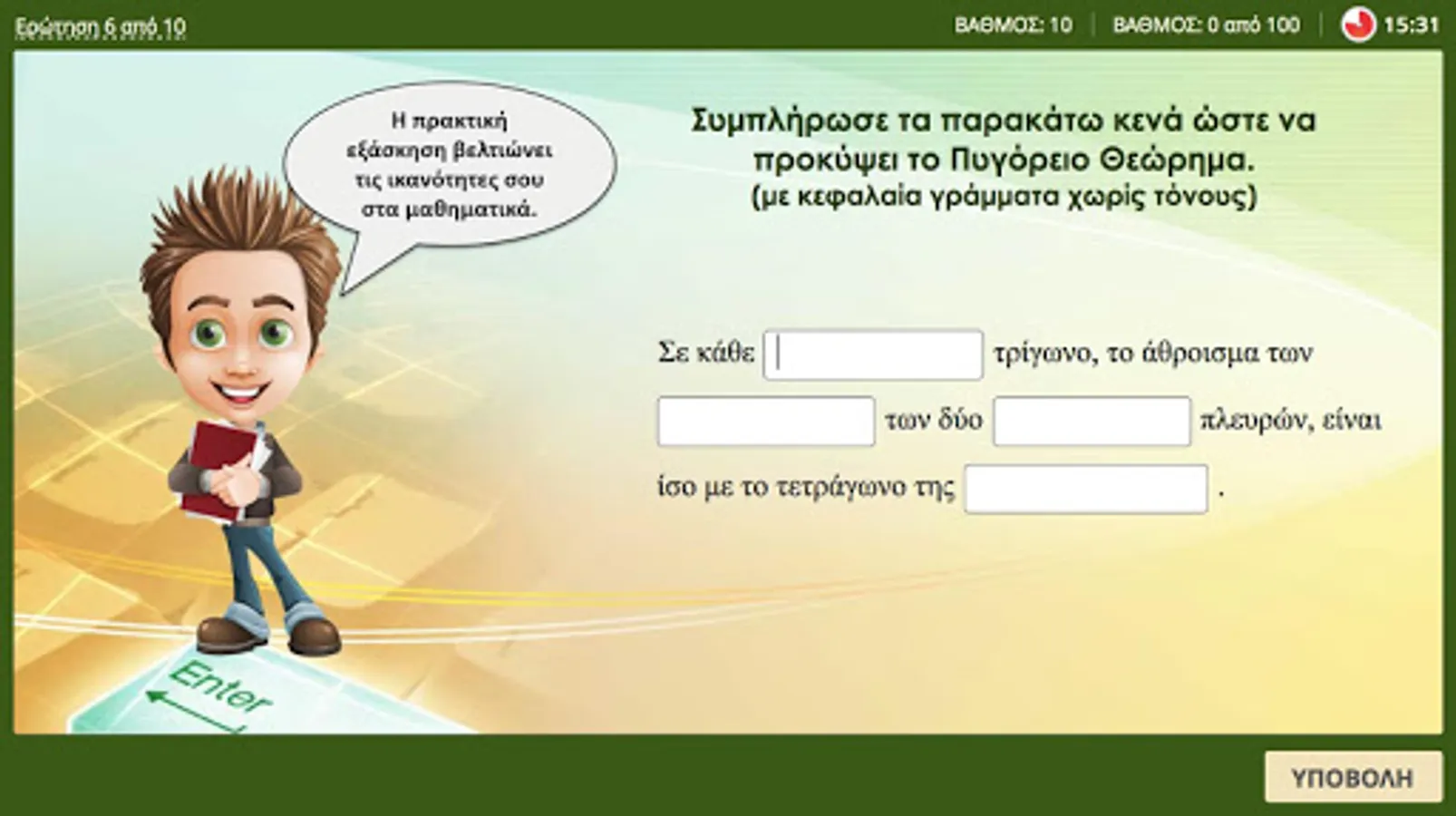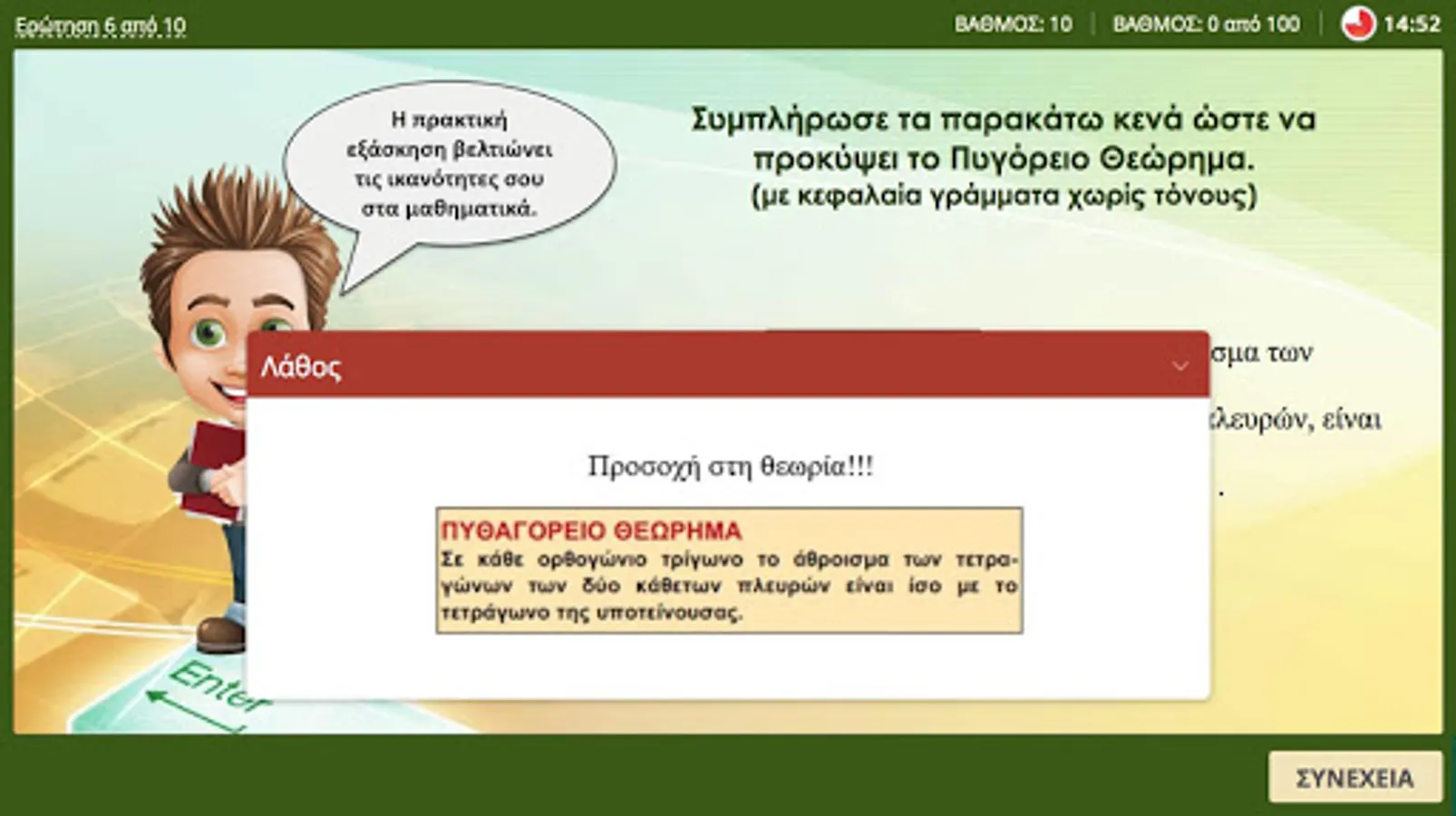 Implementation, for the preparation of the students of b-high school in all subjects, for the promotional examinations. Each time the application runs, 10 questions are randomly selected from within a topic table, with the aim of making the student complete and effective to repeat it. The great advantage of the application is that every question that the student answers incorrectly immediately shows the right answer fully justified! The educational value of the application is mainly based on Crowder's theory, according to which "error is an essential element in the learning process. More specifically, when the student is mistaken and given supplementary explanations then he can overcome it."