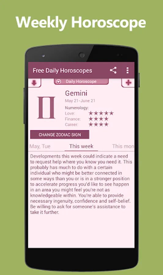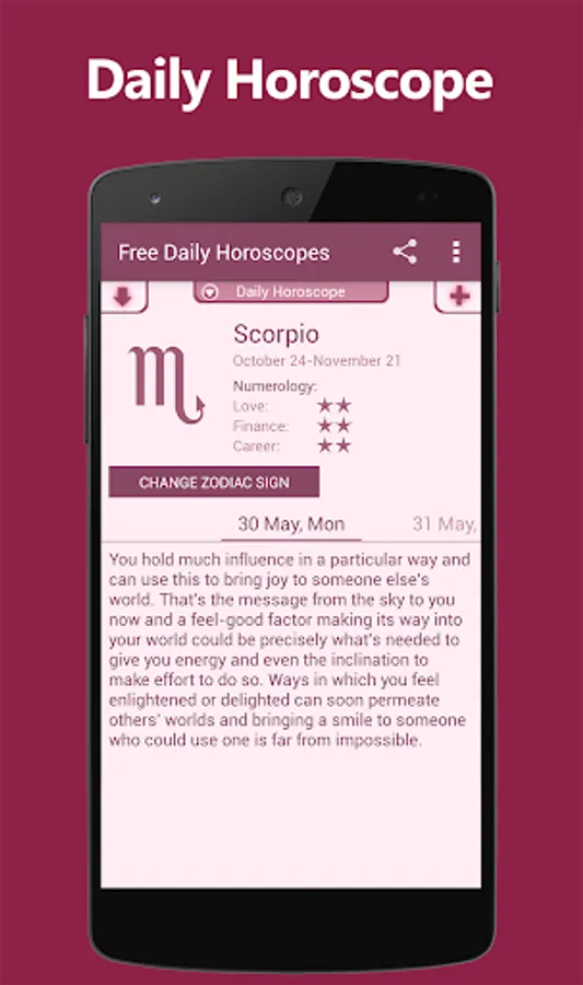 The application «Free Daily Horoscopes» shows the astrological forecast from a professional astrologer for today, tomorrow and for the week. Horoscope is updated every day.