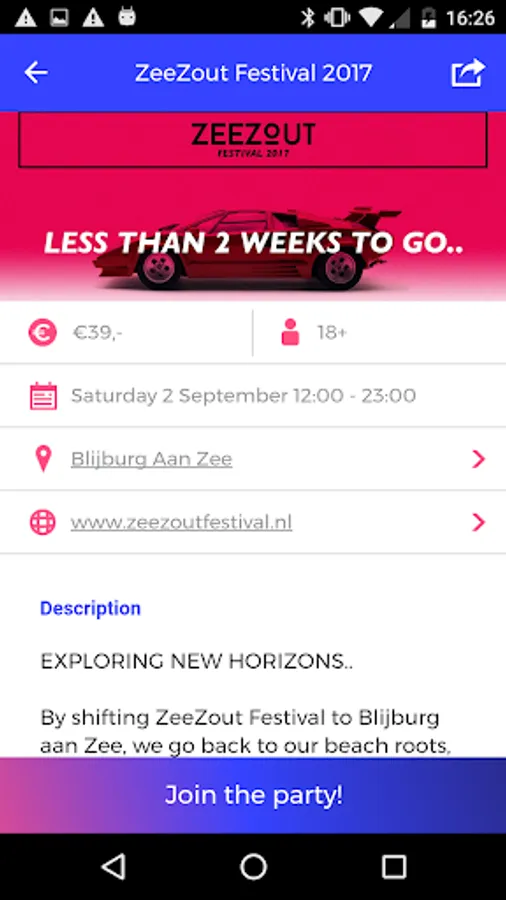 GoneOut is a must have for everyone who’s looking for a party. It contains the most up-to-date party agenda with all parties. This includes festivals, beach/house/pop parties and many more! It provides information like DJs, Entry fees, Minimum age, how many people are going and a link to the tickets (if available).