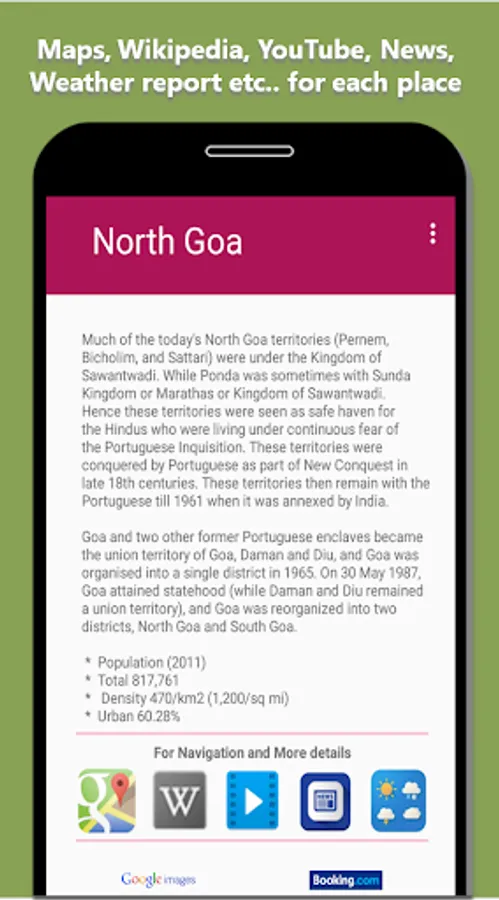 Goa is a state in western India with coastlines stretching along the Arabian Sea. Its long history as a Portuguese colony prior to 1961 is evident in its preserved 17th-century churches and the area’s tropical spice plantations. Goa is also known for its beaches, ranging from popular stretches at Baga and Palolem to those in laid-back fishing villages such as Agonda. This app brings you the most visited places in and around Goa.