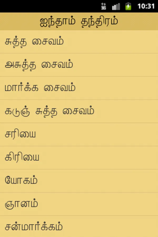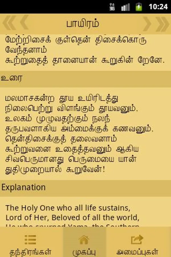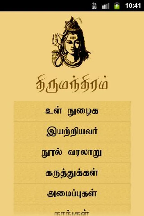 It is the earliest exposition of Saiva Agamas in Tamil, discussing in detail the four related steps of spiritual progress viz.,