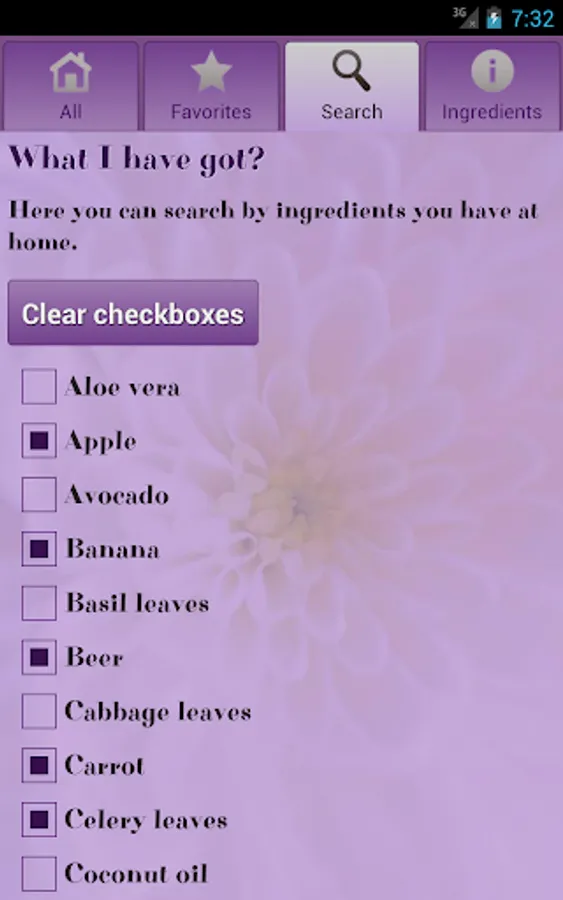 - "What I have got?" - search by ingredients you have at home (the app saves your selection automatically)
