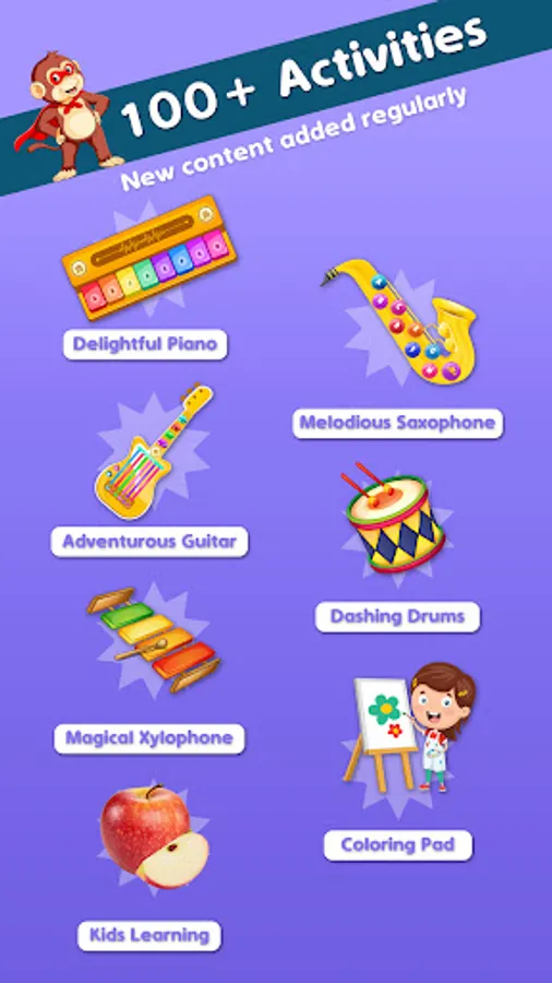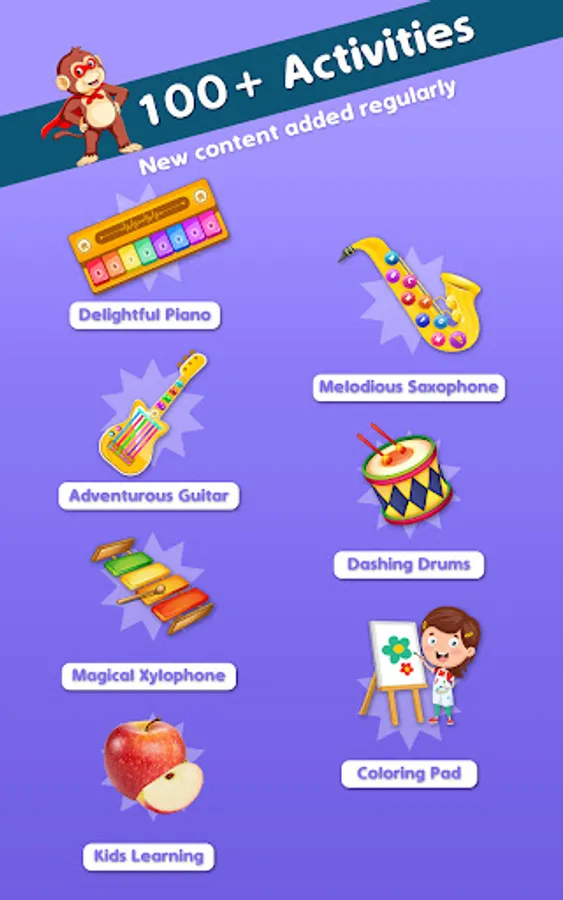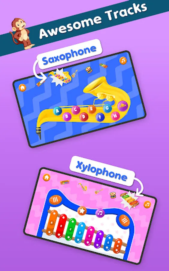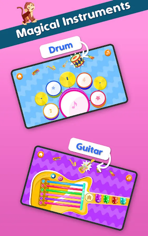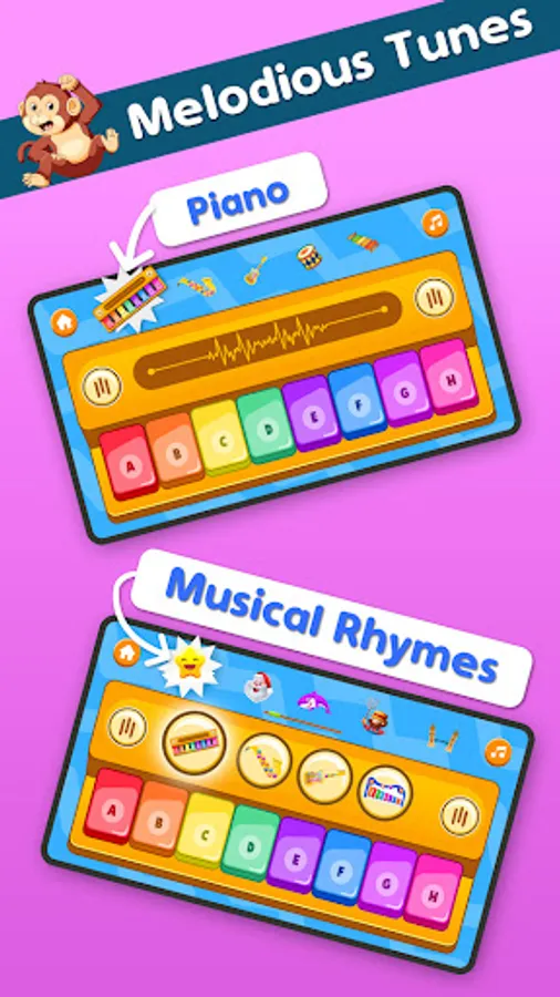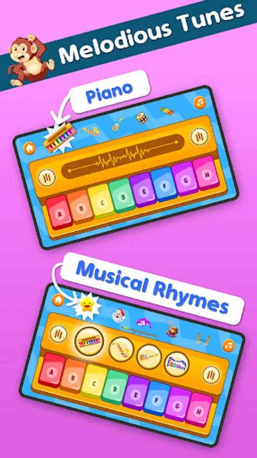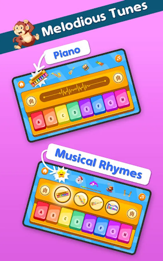 Toddler games for Kids are designed for preschoolers to learn to play music instruments. It features several colorful instruments to learn to play music. In these educational games, kids can learn nursery rhymes by start playing magical keyboard. The 3D animations and 3D effects create excitement to play more.