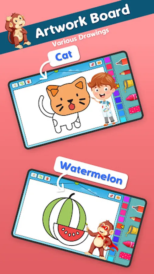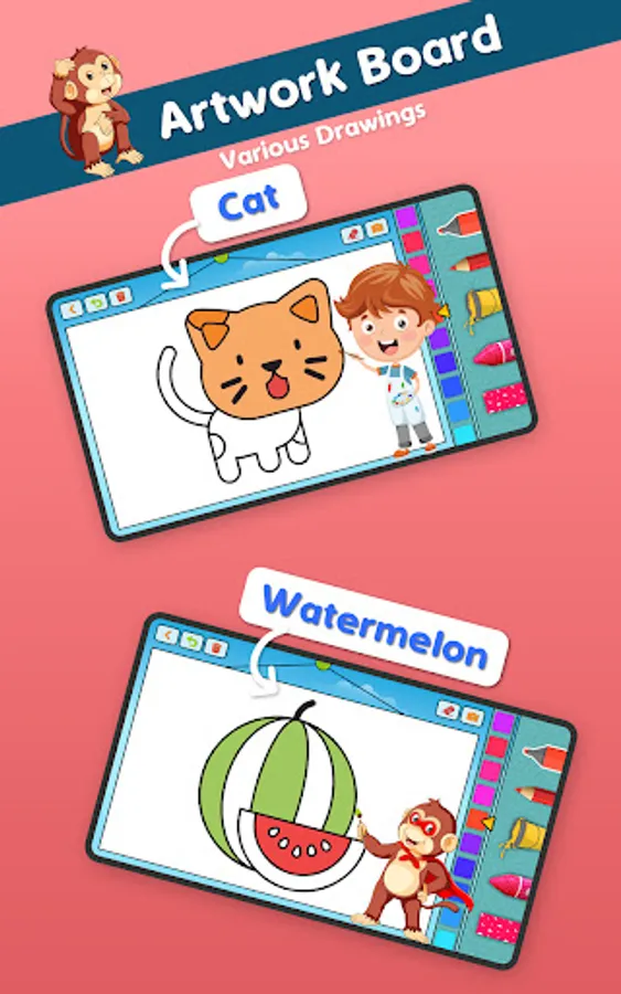 Coloring book for kids is filled with fun, colorful and painting tools that solve your questions like how to learn drawing. In the animal coloring games, every category offers a bunch of shapes and drawings. Instead of using the same brush repeatedly, kids can also make their painting attractive using more interactive options listed below.