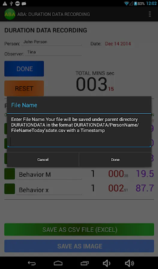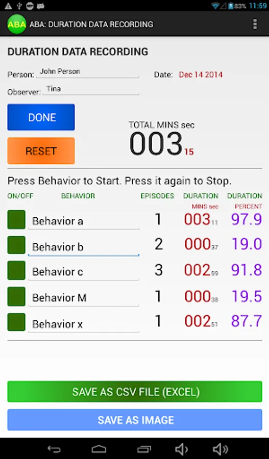 The complex tasks of keeping track of the total duration, number of episodes, total duration in each behavior and calculation of duration percentage for each behavior have all been made simpler with this Duration Data recording app.