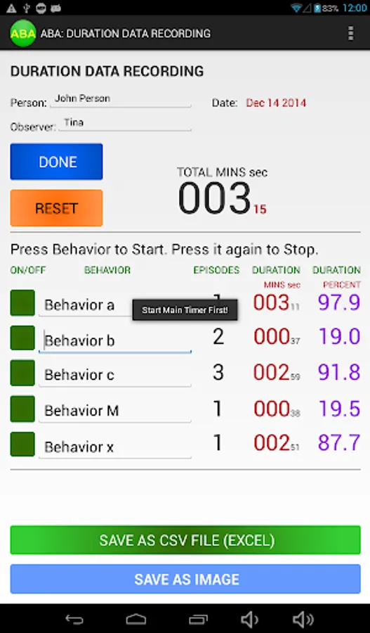 4. Once the Stop button of the main timer is pressed, all the behavior timers are stopped automatically if they are running, and the duration percentage calculated and displayed for the behaviors.
