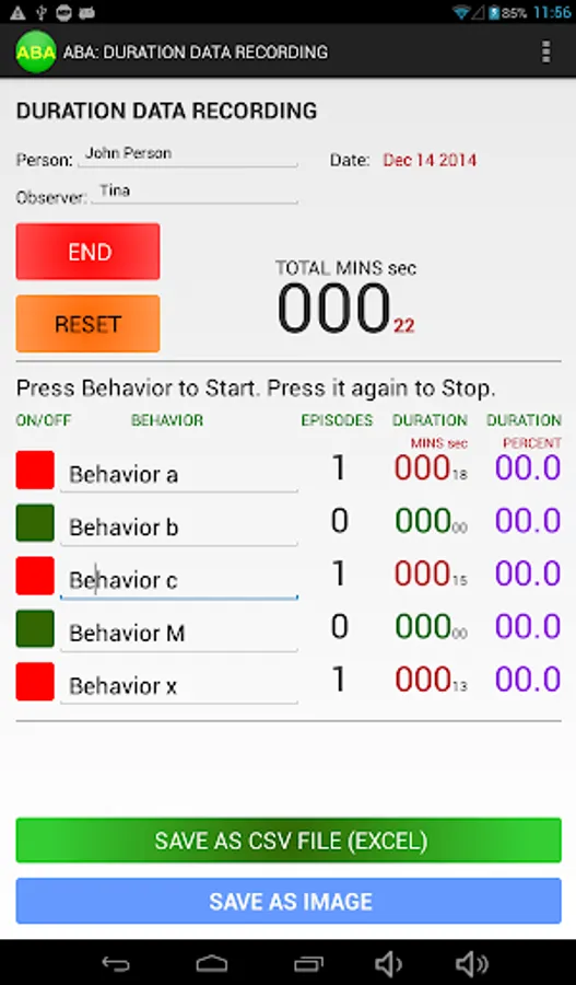 4. Stopping the main timer by clicking on End button will stop all running behavior timers and duration percentage is calculated and displayed for each behavior.