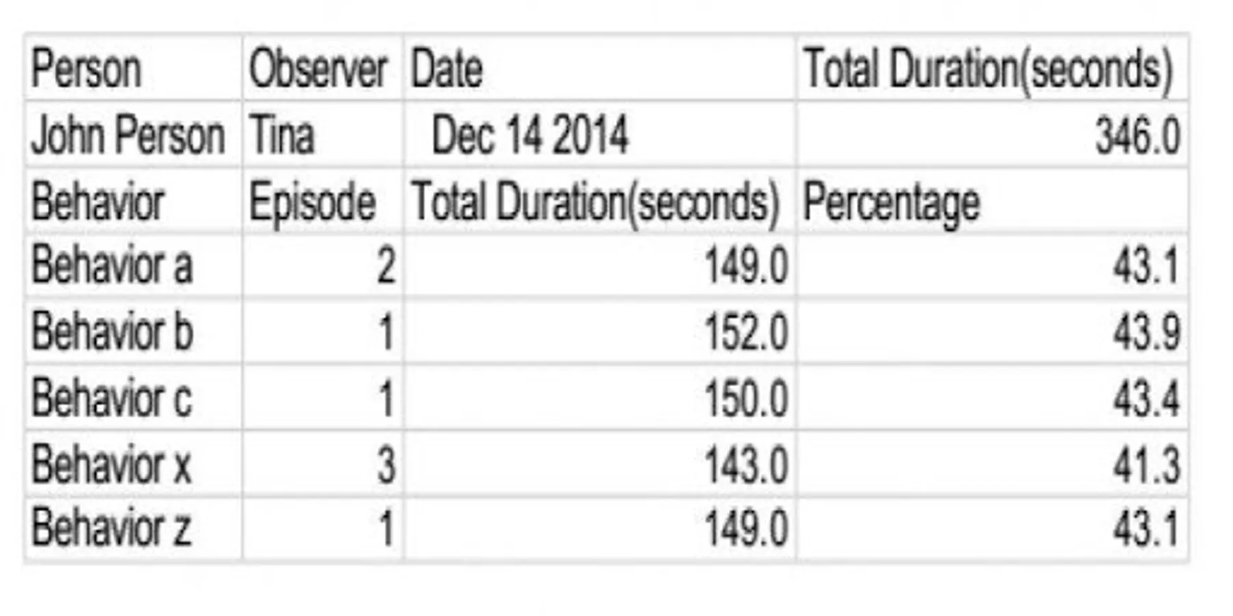 6. Percentage is calculated based on Behavior total duration in SECONDS to total duration in SECONDS.