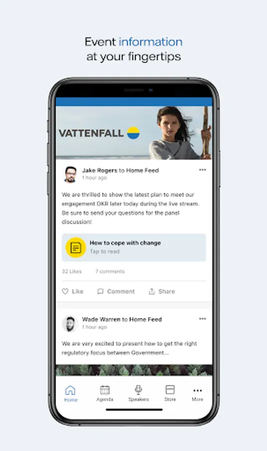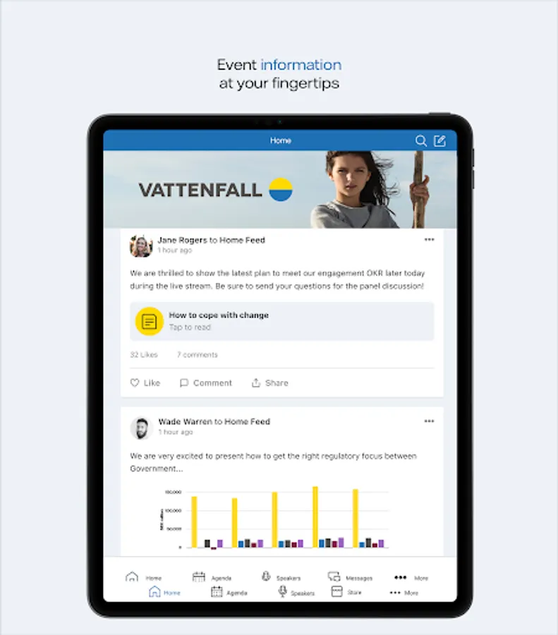 The Vattenfall Events app is suitable for meetings of all sizes, from large congresses to focused business leadership forums. Professionals from leading companies rely on Vattenfall Events to drive ideation, gather audience response, encourage networking, team building, strategy rollouts, and education at their high-stakes events.